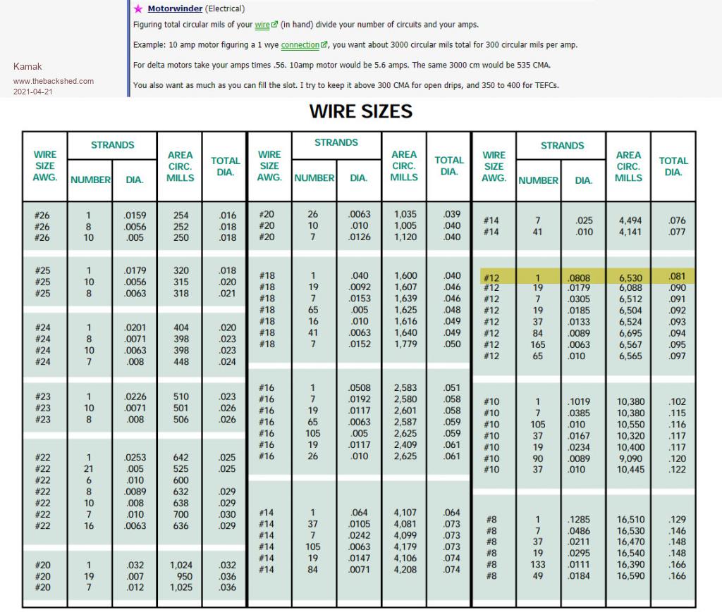 Selecting Wire Size for a 50A Star wound 3PH Generator Using a good rule of thumb of 300-400 CMA (I'll use 400) per Amp Approx 16A per single star leg? 16 x 400 = 6400CMA from the chart, 6400CMA is close to a 12gauge single strand wire with 6500CMA. ![]() Edited 2021-04-22 06:12 by Kamak |