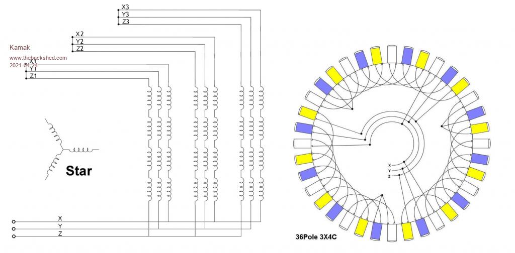 Selecting Wire Size for a 50A Star wound 3PH Generator (even if it could achieve this) @ 24V @1200W Using a good rule of thumb of 300-400 CMA (I'll use 400) per Amp Approx 16A per single star leg? 50/3 = 16.66 16.66 x 400 = 6664CMA from the chart, 6664CMA is close to a 12gauge single strand wire with 6500CMA. But.... 50A Star wound 3PH Generator @1200W (even if it could achieve this) @ 48V @1200W That would be 25A For a (3x4C)3, that's 9 parallel legs @ approx. 2.3A per leg. 2.3 x 400 = 920CMA from the chart, 920CMA is close to 20 gauge (0.03196inch 0.8118mm) single strand wire with 1024CMA. But if I select for the worst-case scenario, with 1200W @12V that would be 100A For a (3x4C)3, that's 9 parallel legs @ approx. 11.11A per leg. 11.11 x 400 = 4400CMA from the chart, 6530CMA is the nearest single strand wire to 4400CMA which is 12gauge (0.08081inch 2.053mm). That's much higher than 4400CMA, but it's the nearest. standard gauge single strand size "above" the CMA requirement. There would be no worries about voltage drop or heating using it for 12V service. (3x4C)3 @48V is approx 150 RPM (from the F&P chart)? Unknown for a Samsung BLDC Generator with changed-out magnets and rewired with the proper gauge copper wire. ![]() Edited 2021-04-24 00:54 by Kamak |