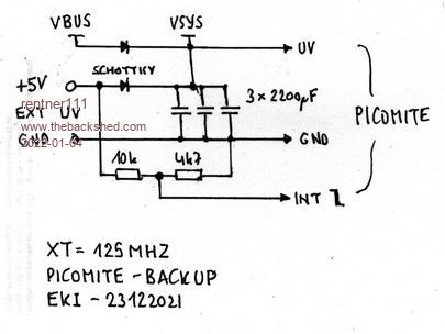 If your main power is via USB you can read VBUS (i.e. that supply) using PIN(GP24). If you now connect a reasonably sized battery (say 2 or 3 AAA cells or even a 3V coin cell) to VSYS via a schottky diode then you have an emergency backup. There's no current drawn from the standby supply normally as it's diode is reverse-biased. Test GP24 to see if your main supply is healthy or not. If it isn't then read GP29 to check the on-load voltage of your standby battery (it reads VSYS/3). GP24 going low could trigger an interrupt to close files etc. You wouldn't need a lot of capacity or voltage from the standby supply as the Pico SMPS is happy down to 1.8V input. It's quite possible to add an external Li-ion battery & charger to the Pico. It's also possible to switch the standby supply via a mosfet so that you have an even lower voltage drop than the diode. Edited 2022-01-04 20:44 by Mixtel90 Mick Zilog Inside! nascom.info for Nascom & Gemini Preliminary MMBasic docs & my PCB designs |