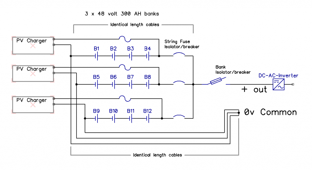 This is how we have wired our 48 volt 900 AH bank: Each bank has its own 60 amp charger, all cables back to the inverter bus bar common connection are same length. When I worked installing large banks of telecom batteries at micro-wave sites, where there were maybe 6 x 48 volt banks all in parallel, this was the method of wiring; never had any issues with uneven charge\discharge. Cheers Mike Edited 2021-12-18 11:18 by Solar Mike |