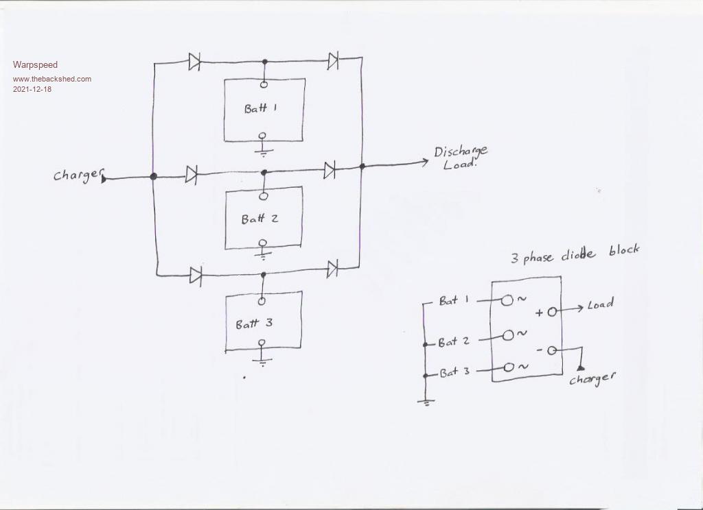 You could always do something like this : ![]() ![]() Three batteries in parallel, but they cannot discharge into each other if one craps out. It could be done very easily with a standard six diode three phase rectifier diode pack. Six, nine or any number of batteries could be connected up this way. Edited 2021-12-18 10:02 by Warpspeed Cheers, Tony. |