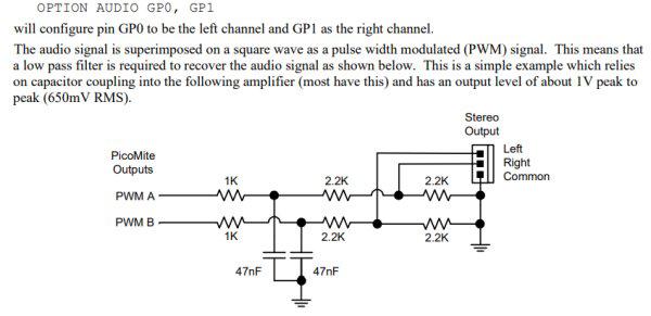 I have just noticed a possible mistake in Picomite manual 5.07.03 SOUND OUTPUT P29 Manual says: The PicoMite can play stereo WAV files located on the SD card or generate precise sine waves using the PLAY command. Before these commands can be used the output pins to be used must be allocated as audio outputs. This is done using the OPTION AUDIO command. For example: OPTION AUDIO GP0, GP1 will configure pin GP0 to be the left channel and GP1 as the right channel The Picomite hardware diagram on P9 shows GP0 (Pin1) as PWM0A and GP1(Pin2) as PWM0B. According to OPTION AUDIO description above, GP0 should be the LEFT channel. But the Sound output diagram shows PWM A as connected to the RIGHT channel: ![]() 1. Which one is correct? The description or the diagram? Is PWM A the left or right channel? 2. Also, the description for OPTION AUDIO on P75 does not indicate Left/Right channels. Edited 2022-01-23 04:36 by flasherror |