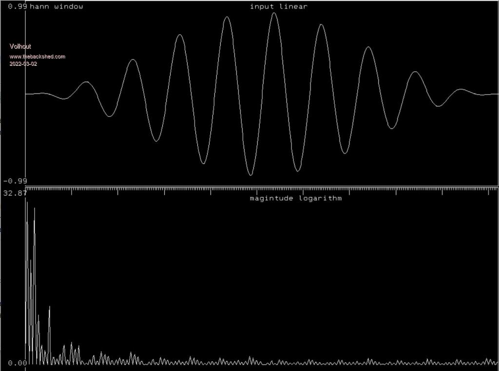 However, the MMB4W math function shows many spurious peaks. Below graph shows the sinesquare windowed sine signal (top), as well as the fft (lower graph)