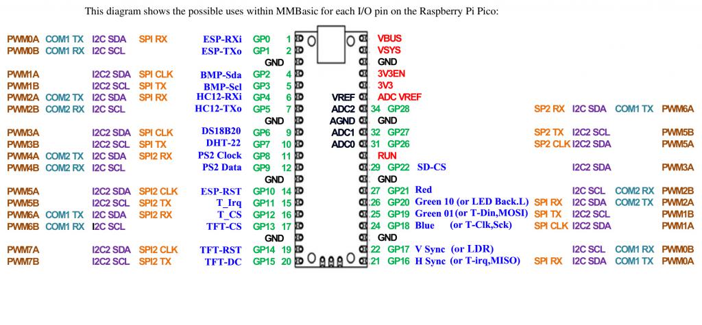 Hi All, @Gerry, Thank you for that quite extensive program. I ran it on my ILI9341 to see if I get the same result as you but It (from my understanding) fails the TFT chip read test This is the result I get with an ILI9341 (I tried two different ones a 2.8" and a 3.2") > RUN Hard Reset Send NOP Soft Reset ID &H04 HEX 0 0 0 0 TEST TOUCH CHIP Read TEMP1 845 Read TEMP2 995 > I changed the configuration for my setup as follows: 'MICKS CONFIGURATION LCD_DC=MM.INFO(PINNO GP15) LCD_RST=MM.INFO(PINNO GP14) LCD_CS=MM.INFO(PINNO GP13) SD_CS=MM.INFO(PINNO GP22) T_CS=MM.INFO(PINNO GP12) T_IRQ=MM.INFO(PINNO GP11) MYSPI=1 '2 id using spi2 pins SPITX=MM.INFO(PINNO GP19) SPIRX=MM.INFO(PINNO GP16) SPICLK=MM.INFO(PINNO GP18) I have checked and triple checked I think I set all of the PINNO correctly. This is the list of the Pin Allocation on my PCB. Note My allocations are in Dark Blue ![]() The Result with the ILI9488 returned a very similar result, the only difference was the TEMP values which were close but a few numbers off I think the RESET/ID &H04 HEX should not return all 0 for all four positions Is there some other setting I need to make in your code? Kind Regards, Mick Mick's uMite Stuff can be found >>> HERE (Kindly hosted by Dontronics) <<< |