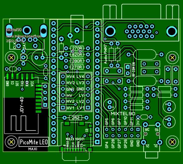 Coming up very soon now - PicoMite LEO Maxi If you only wanted it for this project you could leave off the JDY-40, all the audio stuff and the linear regulator. This is a baby board - 72x54mm - there's no case. You'd probably have to either have the SDcard internal or 3D print one to fit. Alternatively, I could soon do something based on this, with the clever bits removed and , if I can route the traces, do a bigger GPIO connector that includes the extra five pins. I can't do a lot with the JDY-40 side, but the other side can be mostly spare space once all the audio stuff is gone. Using a SSD1963 would be nice, but they are quite expensive to have near a drill and you don't get many spare pins when they are driven from a PicoMite. Mick Zilog Inside! nascom.info for Nascom & Gemini Preliminary MMBasic docs & my PCB designs |