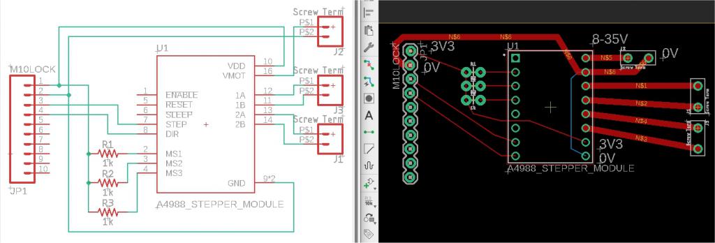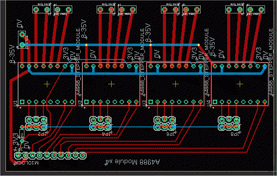 I've played with your A4988 module. Here is a daughter board which would plug into or solder on a board I already have that breaks out 8 I/Os plus 3V3 & 0V--that's the 10-pin header on the left: ![]() If you like it, 3 more A4988 modules can be added below. There are pads for 3 optional pullup resistors to adjust the resolution of the steps. Anybody else--please point out errors or omissions. ~ Edited 2022-07-15 05:34 by lizby PicoMite, Armmite F4, SensorKits, MMBasic Hardware, Games, etc. on FOTS |