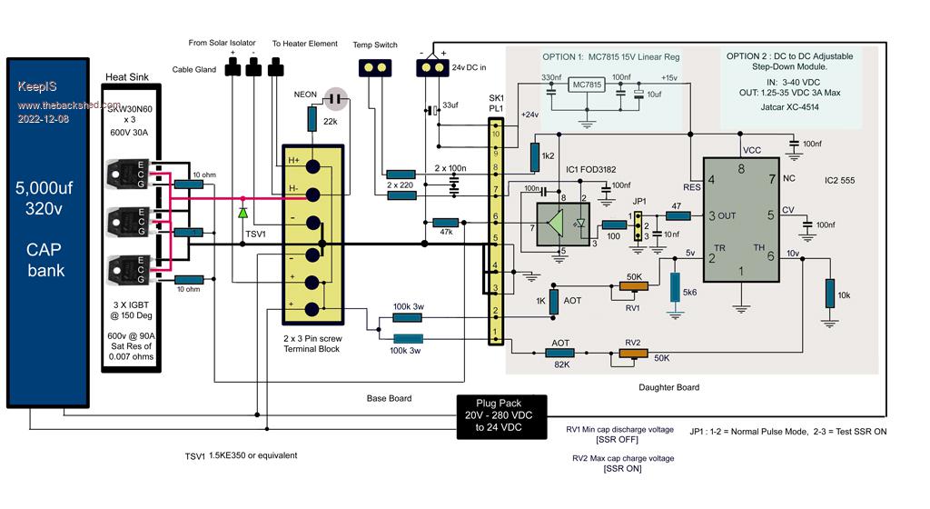 This is easy to adjust, I have wired the 2 x 50K 10 turn variable resistors in a way that means turning clockwise will raise the High or Low cutoff voltage, obviously counter CW lowers them. The Top Cut off can be set to the Highest voltage that will allow the Controller to still charge the cap in poor solar conditions. The low cutoff is the harder to set as it's dependent on the element resistance, total Storage capacitance, and panel current/voltage. I've think I've come up with a simple quick way but I just need the time to get a low cost item and test it.
