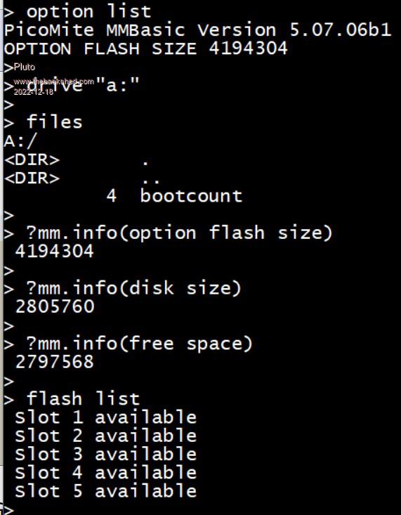 Forum Index : Microcontroller and PC projects : PicoMite V5.07.06 preview - flash file system