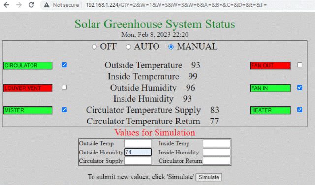 After a depressing number of errors on my part, I have my program accepting inputs from the web page and making appropriate changes to the output web page: ![]() I can change the mode: Off, Automatic, Manual; I can change which outputs are to be on and off: CIRCULATOR, FAN_OUT, LOUVER_VENT, FAN_IN, MISTER, and HEATER; and I can specify simulated temperatures for running the program in AUTO mode. Next I have to write the code to actually turn the pins on and off based on actual or simulated sensor readings for temperature and humidity. I started this project in 2017, planning to use a 28-pin Micromite and I don't remember which serial TCP/IP module. I wrote about 500 lines of code, but never did the hardware, so didn't get much testing done. The program is far from ready for prime time. I'm very happy to be able to pick this up now with the Picomite. In 2017, I didn't have a solar greenhouse. I still don't, but I do have a solar "shedlet" that I built last year which has two used 270W panels. This program will enable me to get some practice in integrating everything. (I had to power-cycle many times. I hope in his tidying up Peter will smooth out some of those glitches. I also hope that DS18B20s can be made to work reliably--otherwise, I may need to use a co-processor. There's also a problem with getting Day of the Week from the Epoch date which I have to track down.) ~ Edited 2023-02-09 13:47 by lizby PicoMite, Armmite F4, SensorKits, MMBasic Hardware, Games, etc. on FOTS |