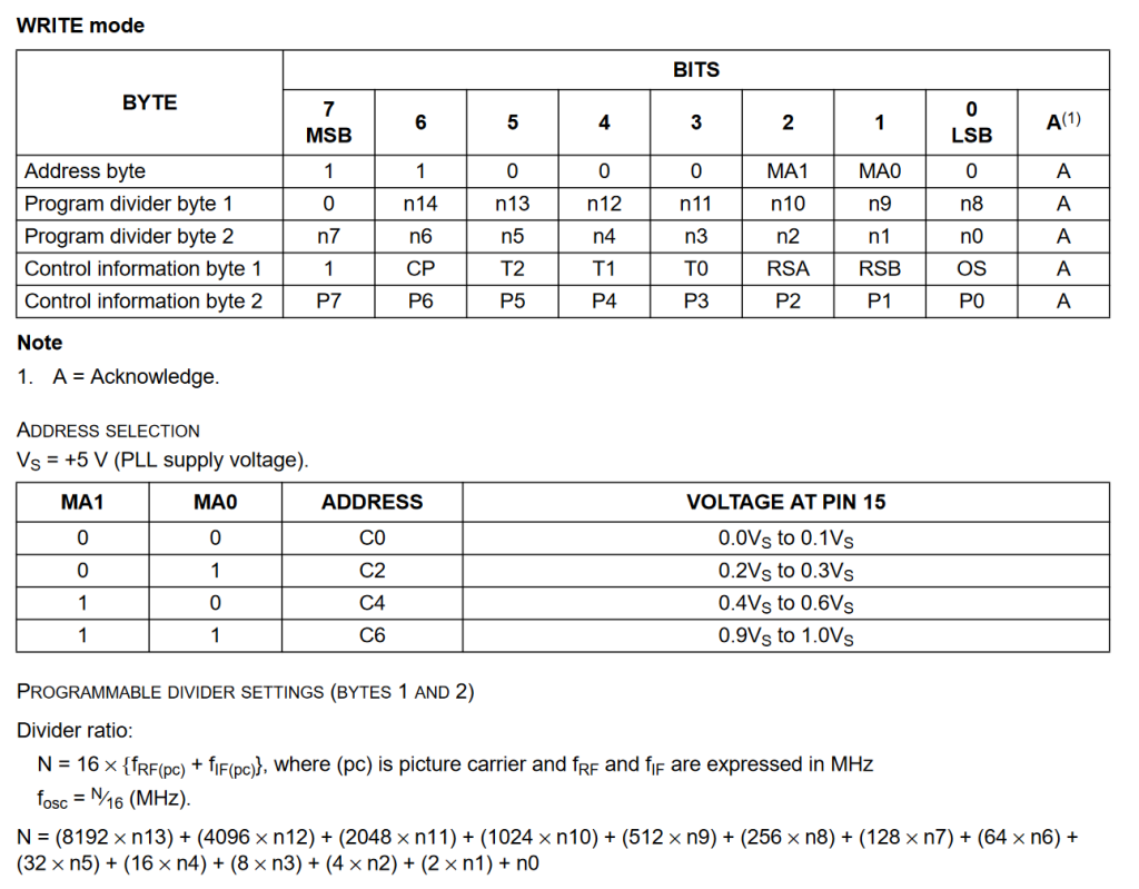 P.P.P.S. the PLL's crystal is typically 4MHz, so the values n0...n13 are multiples of 4MHz/16 = 250kHz, which I find strange. But it could with n0..n13 (14 bits = 2^14 = 16000. This could tuner to 4GHz. That is why I expect the step frequency on the PLL is 1MHz/16 = 62.5kHz. That would tune to 1000MHz. Better for a analog TV tuner.