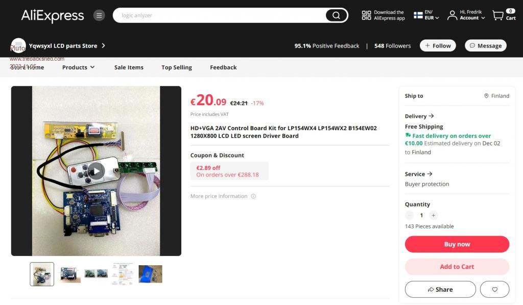 John, VGA #1 VGA #2 These are the board I have used. They were both for old LCDs with high voltage neon backlight. The first step is to open the laptop display and find the type number of the display. Then you can try to find a supporting board on AE. Message with the potential seller and ask for their suggestions. At least from one of the sellers I got 3 different proposals for that particular LCD. Believe I took the cheapest. Fred |