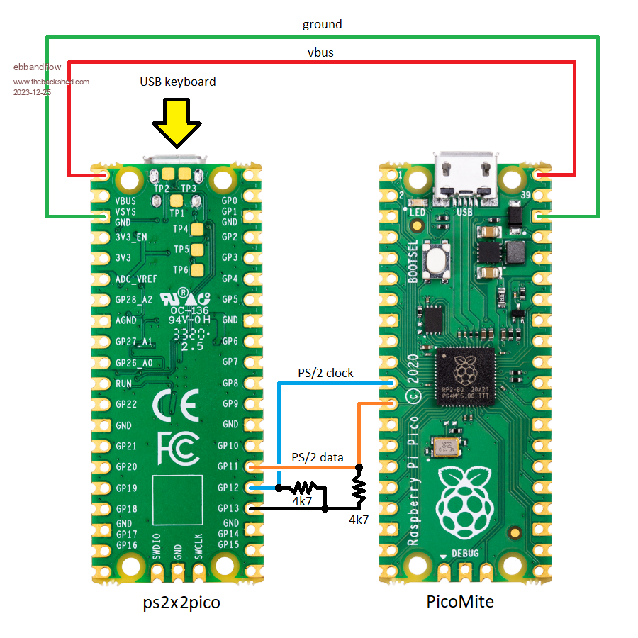 Well, I have a USB keyboard > ps2x2pico > picomite running on my desk and I'm quite pleased! I downloaded and flashed the ps2x2pico as outlined here: https://github.com/No0ne/ps2x2pico#usage but I wired it up as shown below. Now that it's working I plan to experiment with reversing the diode (per my previous post) and joining vsys of the picos together instead of vbus.![]() Edited 2023-12-25 03:28 by ebbandflow |