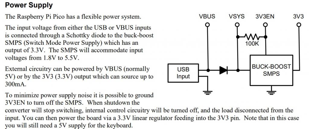 The diode is there because you can damage the USB ports of some PCs if the PC is powered off while there is still a supply on the USB input. VBUS is connected directly to the USB 5V on the Pico and the diode comes off that to feed VSYS, which thn feeds the input of the switching reg. By powering the Pico from VSYS the USB on the PC is protected. The clone Pico boards don't always have the same system. If you are going to use one then it's important to check its power circuit. Mick Zilog Inside! nascom.info for Nascom & Gemini Preliminary MMBasic docs & my PCB designs |