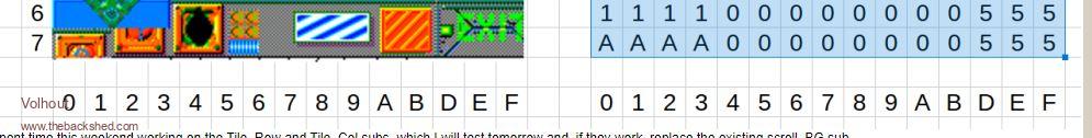 Hi Harm, I think in the next version I will attach 128 bytes with the tile attributes to each map so that they can be read with each map. like this: ![]() I also spent time this weekend working on the Tile_Row and Tile_Col subs, which I will test tomorrow and, if they work, replace the existing scroll_BG sub. -- Once the attributes and the new sub-routines have been implemented, it should be possible to walk through the worlds with the player. Cheers Martin Edited 2024-02-19 07:06 by Martin H. 'no comment |