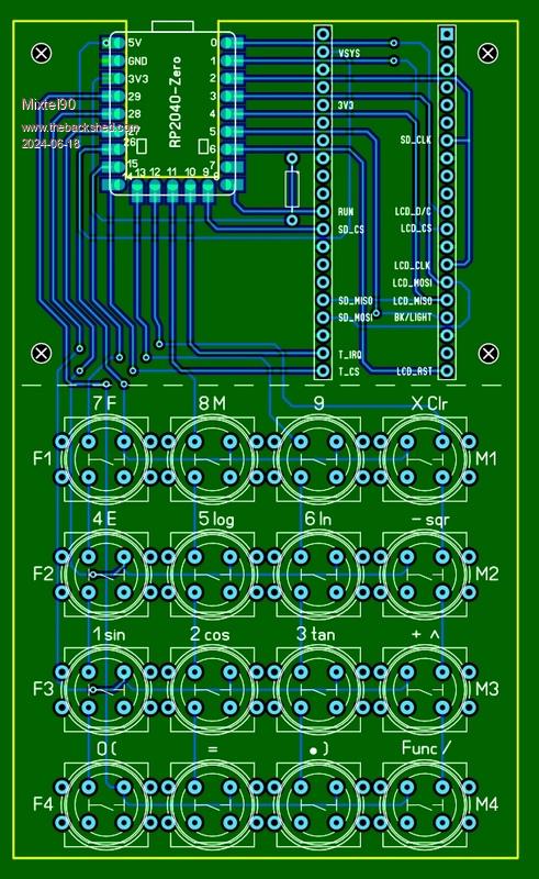 Yes the graphical output on those calcs is nifty! At a few hundred dollars.. It would be possible to do a small indicative-result graph easily enough, but clearly it gets complicated very quickly and limited by i/o and memory, with limited use so is a bit moot. The screen has to be horizontal to hold a useful line of input, otherwise the user input has to wrap around to the next line - ok for scrolling text but lousy in equations. I also looked at putting a 6x6 keypad below the display, and it fits nicely into a "JiffY" but looks very clunky, bit like a old coin telephone and I prefer the lateral format anyway. So the lateral layout with (6x5 and 6x1 keys) it is.I now have set a pcb that holds the display and keys as above. Wondering about the pico and sdmicro socket, they may be better located separately somewhere in the case for the sd card access. Looks like there are pico variants wih sd socket / battery management etc so they might be good options(?) |