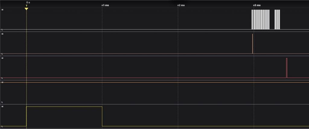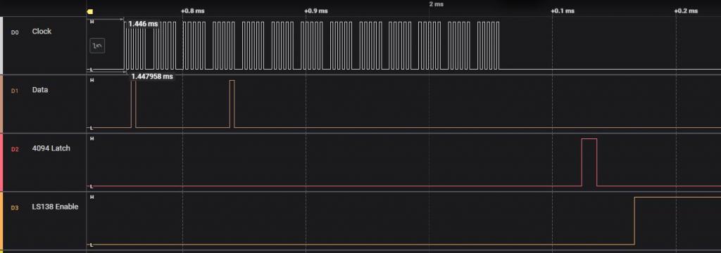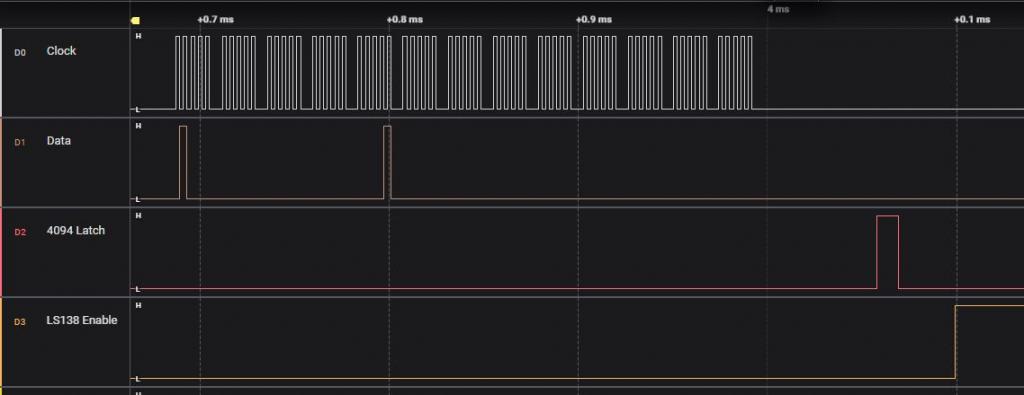 Top trace is clock, next one down is data and the next one down is the 4094 latch, the bottom one is the 1mS pulse to trigger the analyser.