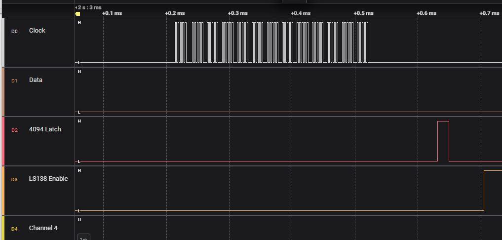 I've set a trigger pulse at the start of the code to trigger the analyser, then captured clock, data and 4094 latch.