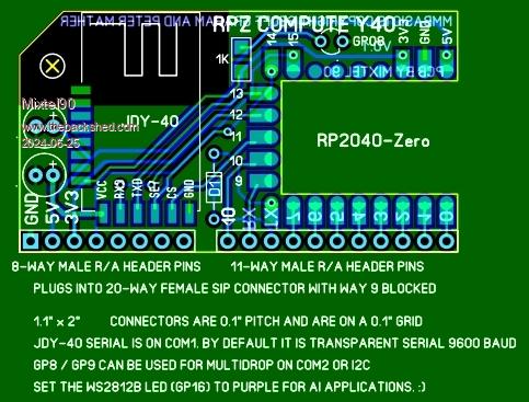 So, that's a ESP8266-01S version done. RPZ COMPUTE ESP Has a RP2040-Zero with a ESP8266-01S wireless modem module connected to COM1. The ADC connector and GP11-GP14 are omitted. GP15 is connected to the INT signal. Buttons are provided for the RST pin and IO0 to assist with programming.IO2 is brought out on GP11 pin of the module and IO0 on GP12 pin. If anyone wants any of the modules in this series, or would like me to produce another version, please let me know. I'm not publishing further design details at the moment as I'm still playing (as you may have noticed...). :) I'm considering putting four modules together on a single PCB so that one order will get you five of each. Probably the original, VGA, BT and ESP but I'm open to any ideas. Unfortunately I can't really get any more than four on - and you'll need to cut them, although JLCPCB would almost certainly cut the notches for the RPX2040-Zero. Mick Zilog Inside! nascom.info for Nascom & Gemini Preliminary MMBasic docs & my PCB designs |