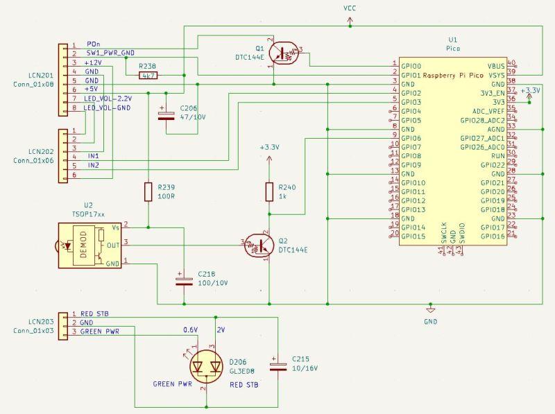 I've not been able to find a data sheet on that IR receiver. It's probably a good idea to change it for a more modern one. Just make sure your remote works with it first though or you'll be sad. :) Looks like you could do that with a RP2040-Zero. There's not a lot of IO. A bit of a pain to surface mount though. A TSOP28328 IR receiver would run from 3V3 and you could lose a transistor. It does the 38kHz decoding too. . Edited 2024-10-31 03:07 by Mixtel90 Mick Zilog Inside! nascom.info for Nascom & Gemini Preliminary MMBasic docs & my PCB designs |