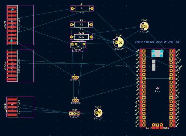 Woooha, I had my KiCad swearing moment when assigning a footprint of the RP Pico. But I did it. The next step is to find out where I can specify the dimensions, for the time being I was going around in circles. @Mixtel90: I did indeed find an RP2040 Zero for €5.00. As you already indicated, there is enough space on the PCB to place an RP Pico. Fortunately, I have not had to make any new objects yet. I am just having a little trouble finding the right component in the endless list with the right dimensions. So far I can keep the PCB within 100mm x 100mm. The wiring with the connector is long enough to be placed on the new location on the PCB. Yes, the signal is inverted because of the transistor, but strangely enough it works. I still have to check whether the transmit codes are also correct in the normal or inverted situation. phil99 also suggested to just use a pull down resistor on the output of the remote sensor or a Schottky diode to 3.3V. @phil99: thanks for the input, I'll test it. Thanks, both of you for the input. |