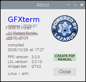 Unfortunately, I couldn't find the GFXTerm version for Raspbian anywhere either... P.S.: I just found this version from 2020—is it the only one? https://www.thebackshed.com/forum/ViewTopic.php?FID=16&TID=12154#146916 Frank Edited 2025-12-14 05:41 by Frank N. Furter |