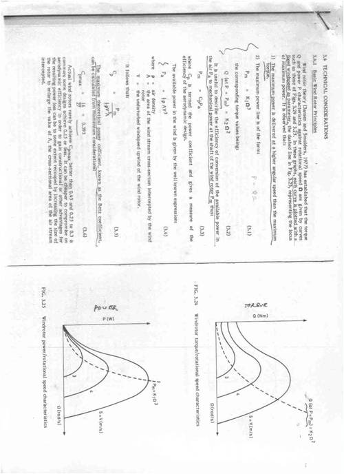 Hi again Bob, In your post of 5-12-09 on this thread you ask if you would not also see the same power tracking (double volts, 4 X current) with your device if you were tracking somewhere off the actual maximum power point. The attached family of power and torque curves for a range of wind speeds leads me to think that the answer is no, as it appears that the extractable power will only follow a cube law at the optimum TSR. Still pondering that one though, particularly the effect that you would see if operating on the back of the power curve (ie above optimum TSR). Your second question asks whether you could confirm that you are operating at the maximum power point by removing the load under steady wind conditions and noting whether the alternator output voltage doubles. Having looked a few TSR/power curves, I am inclined to think that this is probably a fair test, as most are similar in shape to your “Quixote” curve. You could be more confident of this if the Princeton plot was for your specific blade design, but I have no doubt that you are well in the ball park. The following comments might be of interest concerning your electronics. They represent things that I have found out the hard way. Your air cored inductor will have a reasonably extensive flux field around it. Be careful of adjacent metal, such as the aluminium heat sink for the FETs, as this can act as a shorted turn if too close and parallel. Best to fix the coil at right angles to the aluminium, and keep any other metal away. I am not sure what actual DC voltages that you have to drive your electronics, but being derived from 18VAC transformer windings, I imagine that you could have something around plus and minus 24VDC. While this voltage might whip the 741 op amps into some sort of performance, I am concerned as to what voltage the LF351 is applying to the gates of your IRFP150 FETs. Maybe also I am missing something, as you talk about having +/- 12V control voltage, so maybe you have the transformer primaries connected in series?? From the LF351 data sheet, it looks as though the output voltage will be around 1.5V less than the supply voltage, so maybe it will swing between +/- 10.5V, or maybe double that? A voltage of +10.5V would be fine for the FET gate, but I don’t know what happens when the 351 switches low. Does it apply -10.5V to the gate? Generally with FETs you should apply no more gate volts than needed to fully drive them on, and no less than zero to drive them off. Commonly, you would fit a Zener of just above the rated gate voltage (maybe a 12V Zener in this case) between the gate and the source both to swallow any positive spikes, and to limit any negative voltages on the gate to less than -1V. These Zeners should be fitted right at the gate terminal to swallow any spikes induced in the gate wiring. Note also that if you fit Zeners at the gates you will need a series resistance in the gate lead, particularly if you leave the 351 powered as is. Maybe you could consider powering your 351 from +12V and ground, rather than +/-12V. FETs should be set up to switch on or off as quickly as possible. This means that the gate voltage should go from positive to ground or vice versa as quickly as possible, and should have the capacity to charge and discharge the gate capacitance as quickly as possible. Unfortunately, op amps used as comparators don’t necessarily switch cleanly, as they can tend to dither when their inputs are at equal voltage. While it is possible to use a small measure of positive feedback around the op amp to hasten its switching, (or per haps use an actual comparator) it is still preferable to use something like the hex driver to switch the gate cleanly, and with sufficient grunt to quickly charge and discharge the gate capacitance. On the topic of fast switching, the effect of fast changes in current (and/or voltage) on leads associated with the FETs is exactly the same effect as having them operating at very high frequencies. They need to be kept as short as possible, and clear of each other. Curly tails in the wiring are inductances, and these serve to slow and radiate the switching impulses, and should be eliminated (in the Beta version). Your IRFP150 FETs have an on resistance of around 0.055 ohms each, and I believe that you have three in parallel, giving a potential on resistance of .0018 Ohms. If they are passing, say, an average of 10A of current in total, their individual power dissipation will only be around 0.6W each, which I would not expect to make them even perceptibly warm. Of course, the power dissipation increases with the square of the current, but I would still think that noticeable warmth in operation suggests the need to look more closely at the cleanness of the switching. An oscilloscope is an inestimable help for this. Finally Bob, I was most impressed at the description of your complete turbine set-up that you gave to Oztules. You have obviously gone very thoroughly and methodically into all aspects of your project, and the results do you great credit. As Oztules indicated, arranging the alternator output voltage to be such that a boost circuit can be usefully employed for the lower (and otherwise wasted) winds prior to what would be the normal cut in point certainly lets you suck in the last few drops of the free stuff. Regards