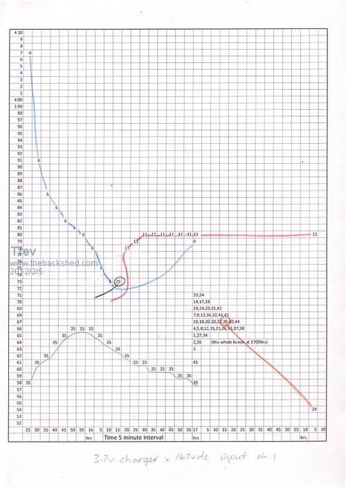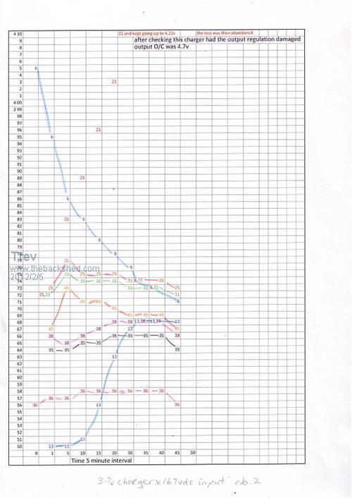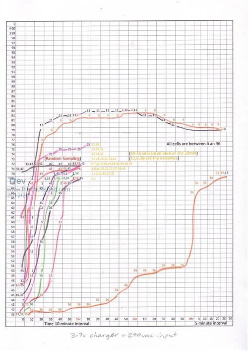 Test 1 The Zivan charger was to charge to it normal voltage of 167vdc and holding battery pack voltage, the 3.7v chargers are switched on. The high volt cells do not get charged, because they are higher than the 3.7v output of the charger, but drain off because the chargers on the low volt cells are taking power to charge. The idea was to get them all to be of similar voltage. The pack at 167v, the highest cell, no.6 at 4.07v and the lowest cell, no. 35 at 3.58v. Only the highest and lowest cell was monitored until it was evident that it was not working. Note, cell voltage come down but then go up. Cell voltage go up but then come down. Output of the chargers were not stable and fixed. Mostly however the cells remained fairly close together in voltage, but not reliable with a number of cells going haywire. Edit: attempting to see what happens with resizing pictures. Pictures need to be 501 pixels wide or more to get the watermark. Pictures above 500 pixels wide will auto resize to 500 pixels wide. Pictures need to be 390 pixels wide to fit 2 side by side with a space between them. No space to picture underneath. To get the water mark on pictures smaller than 501 pixels, upload as normal. Copy the picture, resize to required size and edit post, re-uploading picture with watermark. Or put your own watermark on first. I used to have all my posts with pictures side by side. New software changes the rules. Scanned the graph with different dpi trying to get it bigger, but makes no difference to view size when uploaded. To view bigger, on your web brouser, click tools, click zoom. Trev @ drivebynature.com |