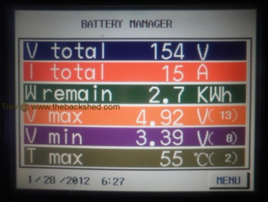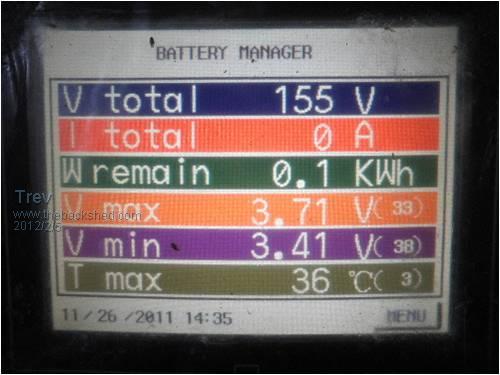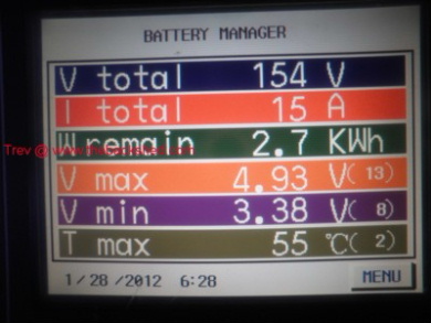 Yahoo2, no problem, you can start a thread if you like. Cell 13 was cell 23. Position 23 is the centre of pack and is always the hottest. This cell showed signs of greater internal resistance. Then appeared to charge higher and discharge lower than the others. I shifted it (the whole 5 cell block) to position 13 so that it would be able to cool better. As stated in a previous post, I had over charged it by quite a bit. This over charging created a masive internal resistance. I continued using it but under normal discharging (driving) it always sagged to 1.0 -1.5v. As soon as discharge stopped it sat on 3.0v +. It was not empty. It still drove me round trip of 75km each day for a good while. It has now been removed from the series string. The last couple of trips was driven with it sagged to 0.0v when pulling around 100-150A. It showed normal voltage 3.0v, with no discharge. Then you can see what happens with 15A charge. The resistance in the cell pushes the voltage up. I believe this is only tension, not really what is in the cell. Terminal voltage only if you like.