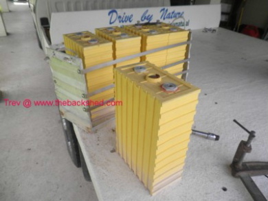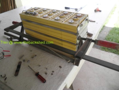 Seperated battery block, shifted cell 13 to the end and then put back together. Clamps hold it together to get the srews back in the stainless stell bands. Back in the Hilux, cell 13 now is cell 45. It just takes up space. It is not connected in the series string. I had to put it at the end so the Battery Monitoring Screen still reads corectly.