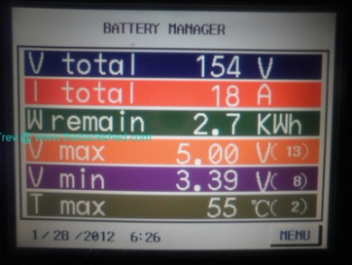Test 2 All cells were monitored. I took hundreds of photos of my Battery Monitoring Screen. Then many hours going through the screen shots to trace the behaviour of the cells. A random sample has been added to the graph, including the highest and lowest cells of the pack. Cell 21 mucked me up. The charger output open circuit was too high and so the test was abandoned after 45 minutes when cell 21 became 4.22v. The results seemed to be a bit more like the expected. High volt cells coming down and low volt cells going up. But take a close look at the cells in the random sample in the middle. The voltage they start from is exactly the same voltage they finish on, no real benefit. So with a pack voltage of 167vdc, high cell,6 started at 4.05v and low cell, 13 at 3.50v and finishing up at high, cell 25 at 3.73v an low cell, 36 at 3.56v. That's 0.17v difference. The chargers are all measured to be close on 3.7v, so the results are not as they should be. Trev @ drivebynature.com |