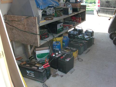 Everyone, Strange things these lead acid batteries, seem to have a personality different form each other. I may have brought back one of the two bulldozer batteries from extinction, and the second one is showing some vavorable response. Here is a picture of the batteries infront of one of my work benches. This is'nt all of them, I still have some in equipment yet, most of the batteries in the picture are old ones, not able to be used any more. The desulphinator is bringing them back to life again. I'm gaining knowledge and faith in restoreing old batteries to usefulness. VK4AYQ, and Yahoo2, thanks for the advice and tips. .....Mac46 I'm just a farmer |