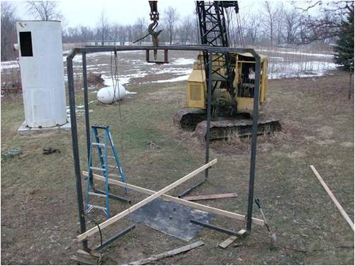 In this picture you find out how I managed to get that stuff up there in the air. The old crain does'nt look as sweet as it used to, but it can still do a hard days work. The white tank is approx. 5 1/2feet in diameter x 13 1/2 feet, and is bolted down to some very substantial concrete...it goes 4 feet into the ground not including the exrtra large footings, all crossed with 1/2" rebar,12 inches on centers. There is also 6" steel I-beam submerged at the floor surface in a "H" pattern, it was a 4000# mix and all poured as one piece. (not going anywhere in my life time). The steel tubeing is 2"x4" 10 ga. side wall and will undoughtedly need futher refinement before the project is finished. Welded with 6010 DC rod for the root pass, 7018 DC for the next 2 cover passes. (Welders do it in all positions) That black mat is rubberized padding, I mostly use it in front of my shop benches, but it comes in handy when I'm outside welding in the mudd too. .....Mac46 I'm just a farmer |