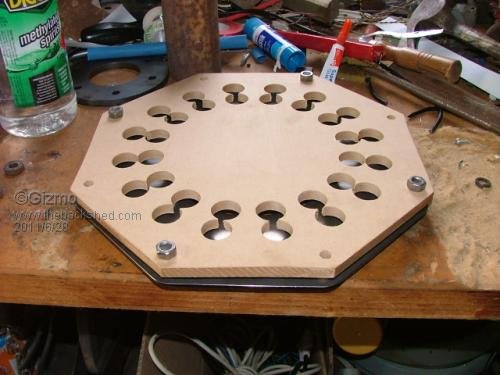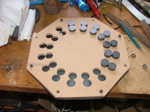 Today I picked up the lasercut steel bits. Pretty happy with the quality and price. Using the magnet template I made earlier, I fitted the magnets to the steel plates. I think the magnet template is a good idea. It was just like putting round pegs into round holes. Add a drop of superglue and drop the magnet in, I didn't have to worry about positioning the magnets, the only thing I had to think about was which pole, N or S. The template was about 8mm above the steel plates, so I could blow down each hole to clear out any dist or wood fibres before dropping in the magnet. Next up I need to make the bearing. Glenn The best time to plant a tree was twenty years ago, the second best time is right now. JAQ |