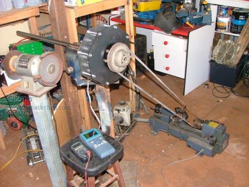 Anyway, made a test coil. 25 turns on a former. Fitted a waterpump pulley to the front of the alternator, then rigged up my little lathe and a loop of rubber cut from a old bike inner tube to drive the alternator. Took a heap of measurements at different magnet gaps, from 9mm to 27mm. Interesting results, will post once I do all the maths, and get a little help from the guru. One thing I noticed was the test coil position is important, I get very different readings when the coil is closer to one side, or in the middle. The photo below shows the coil close to the front magnet plate, 18mm magnet spacing. In this postion I was reading 1.54Vp-p, and when it was mounted in the middle, I read 1.39Vp-p Glenn The best time to plant a tree was twenty years ago, the second best time is right now. JAQ |