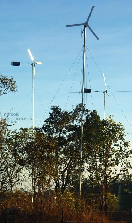 Got around to taking a few photo`s The 200w Jaycar is in foreground, the OEM`s at rear. 200w and lower OEM are on 10m poles the higher OEM is at 12m. The towers appears in photo out of vertical but not so this is an optical illusion. Have all 3 mills on cap-doublers now(as per Gordon`s diagrahm Phils`s caps & rectifiers), best performance at 27km winds 1 OEM`s output 8amps , 200w jaycar 6amps. Recorded using a Mastech MS2108A clamp meter set to give a maximium reading over a period. Ensured both mills were recorded when winds hit 27km/hr. The wind speed recorded by a Sinometer Weather Station.1 OEM has 46m of 2.5mmsq other 40m of 2.5mmsq, 200w has 30m of 1.5mmsq, cable to rectifiers. Contrary to Phill`s logging I do not believe the OEM`s are capable of 1300watts with cap-trebler or doubler into a 48v system. Not even for a brief period under cyclonic conditions. That is 1300/55=23.8amps. Into a 12v system no trouble, the caps load the mills up to much in a 48v system, without the multiplier there would be little output. I agree logging is the way to go, but the logging needs a standard for it to be meaningfull. I do not believe there is any attempt here to misinform I just believe there is an error in the logging, and I accept we will probably agree to disagree on this. The batteries in system weight 1100 plus kg, mills control box is smaller one with 3 digital panel ammeters on top of power box that houses solar regulator etc. 3 Phase swithces are used to brake mills except in the 200w mill, in this case switch is used to switch output into 12v system or 48v system. Interestingly when switched to 12v the doubler is still outputting a litle current into 48v system, with a trebler the 200w mill would brake immediately when switched to 12v. Experimented with the 10v-60v boosters, with and without doublers. Whilst they do work and with more experimenting would probably get better results, I believe they would add complexity to the system when I require for safety and reliability, simplicity. Will continue to monitor Phill`s OEM on internet, taking particular notice of the ampere readings. Especially output with different capacity caps. We come from the land downunder. Vic |
