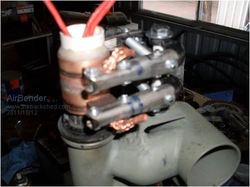 I plan to solder some lugs onto the brush pigtails, then I will drill some holes though the brush arms and put in some small bolts as terminals and then I will run a wire from one arm to its partner on the other side which will link the two brushes together. The wires from the motor are long enough to reach the brush arms so I will just connect them onto the brush arm terminal bolts as well. I have put some terminal bolts through the pvc pipe at the top of the rings which I have terminated the wires from the rings onto and which I will conect the wires coming up the pole onto.