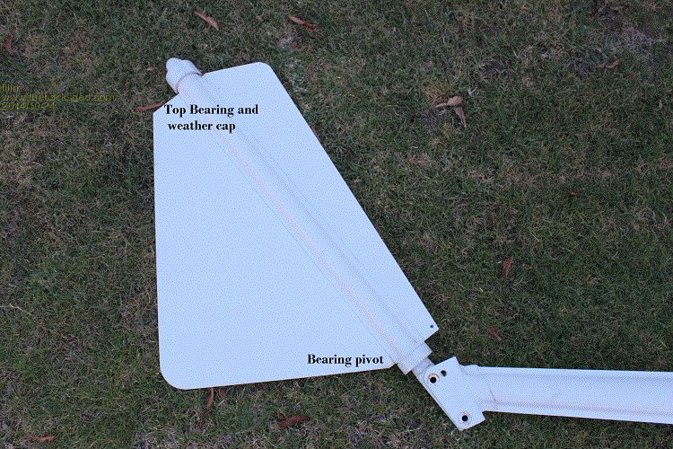 KS, Briggsy, There is approx 120mm of blade off-set so it works on the same principal as a full tail furling. The tail fin is made from approx 1.6mm pressed sheet steel and pivots on an angled shaft, sealed bearings. So with the shaft being angled straight back at 20deg or 15deg ( angles example only ). Because the tail fin has a heavy the weighted side it will always hang in that position trying to keep the turbine into the wind. When the off-set force pushes the tail around against the wind, then the tail fin will pivot to the direction of the wind if the blade off-set force is greater. I actually now am quite a convert for this type of tail furling as it will always allow for cushioning from extreem side gusts and allow for the blades gyroscopic inertia in high wind. After watching a 3.8m set of blades hit the tower and destroy themselves because the tail was hard against a stop and blades spinning at high RPM, then with a strong side gust pushed the tail on the stop violently this was enough to cause flex in the blades and strike the tower. I have one 2kW down preparing it for the customer, here is a pic of the tail.