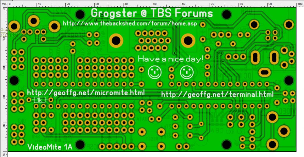 Hey Grogs is that left hand smiley face on the `back side' ME? Minor Criticisms. If you can make the + and - a bit bigger font for power input it would be better. If you can move the USB from the jumper up and maybe r/a (with a line pointing to the pin if needed) then the CENTRE POSITIVE message can be level with 5vDC IN and the entire message enclosed in the BOX. Regards, Mick PS. Were you able to shave 0.5mm off the height to panelise for cost saving? Although on second thought that might not be necessary anyway 2 x 50mm boards with the vee groove down the centre would probably be ok anyway.. If you want me to create a border outline with cut outs gerber for you let me know. PPS. My second lot of boards arrived from Shenzhen today, the first lot took 14 days for postage, this lot took 16 days.. Not bad for the price compared to the expense they want for DHL. Regards, Mick Mick's uMite Stuff can be found >>> HERE (Kindly hosted by Dontronics) <<< |