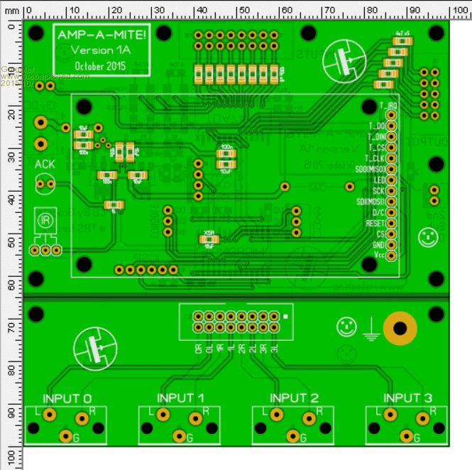UPDATE New version of the main pre-amp board. This is a 100x100 panel, but with two seperate boards on it - the main board, and the input sockets board. Technically, this is a multi-design panel, and the likes of Shenzhen2U will charge an extra US$9 for designing like this(they call it 'Sub-boards'), but I still think it is cheap for the price - US$20 or so for ten sets of boards - pretty good!
