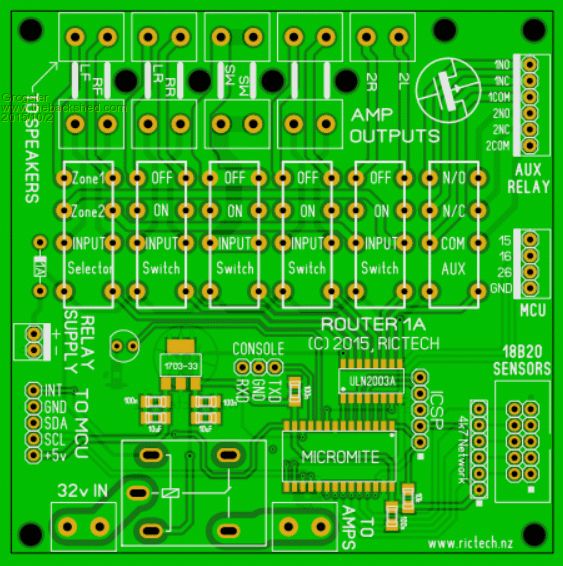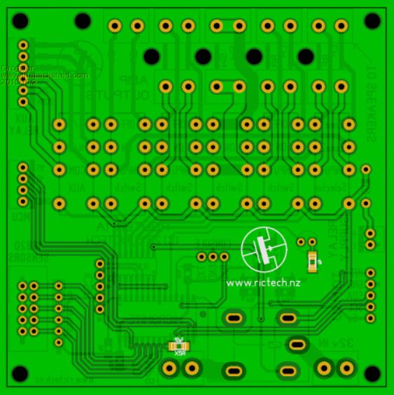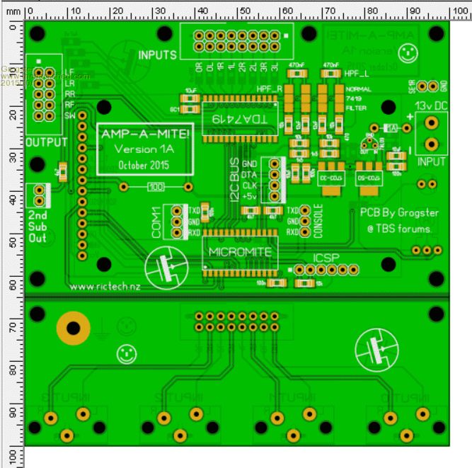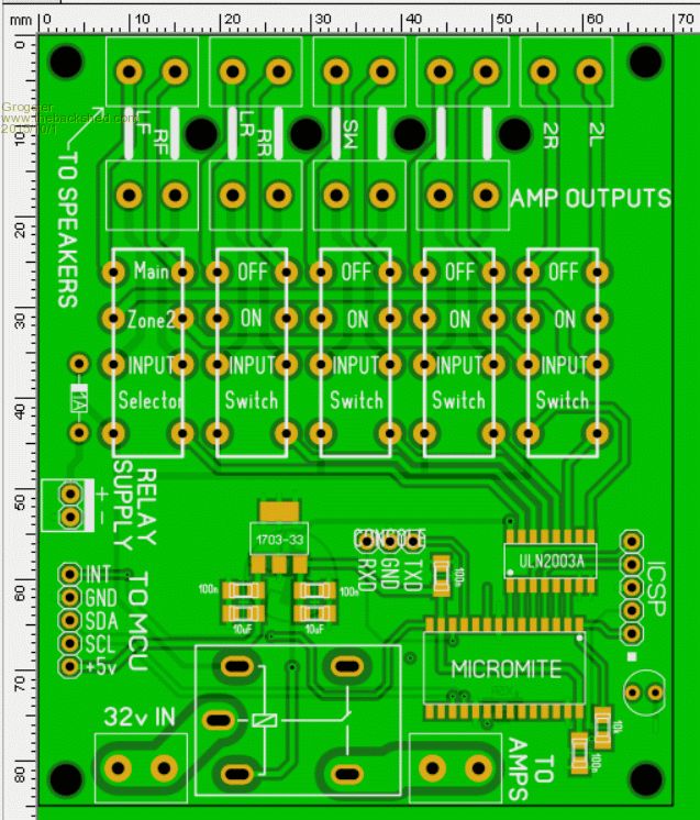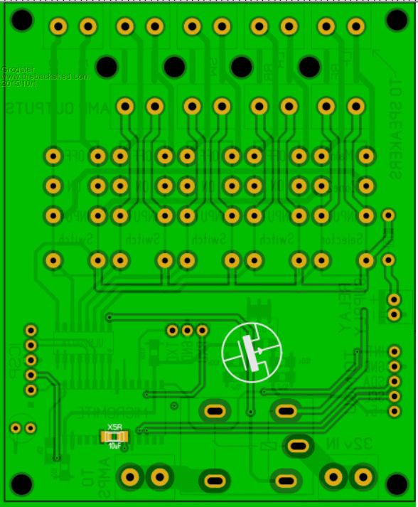 Traces made much thicker around the subwoofer speaker relay, as this one when thumping hard, can be passing a quite respectable current. Trace width of 2.5mm on 1oz copper board allows for up to 5 amps of thumping current for the sub - about 160W RMS for the sub(at 32v) The other speaker tracks are 1mm, which is good for 2.5 amps on 1oz copper - about 80W RMS per channel(at 32v). What all this means is that unless you are running the amp at the Motorhead #11 setting(out of ten!), then the relays and tracking around them should be able to cope with just about any amps you connect to the system. I will be ordering the boards next week, so I can start building. I expect that the problems will surface once I start trying to talk to the 7419 chip via I2C.