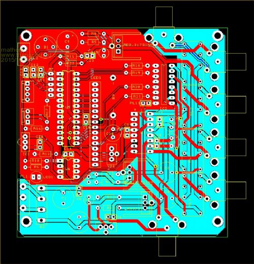 I added one more relay so as to use the full ability of the ULN2003 chip. This last 7th relay is not assigned to anything, but it might come in useful at some point. The remaining three unused pins are routed to the MCU header - they might be useful later too - you never know. The plan is to control the relays with a single byte from the master. The byte will control the PORT command for the relays connected via the 2003 to pins 2-7 by setting the PORT command. PORT(2,7)=BYTE_SENT_FROM_MASTER kind of thing. The board allows for up to five separate 18B20 temperature sensors running with parasitic power, to monitor up to five different heat-spots inside the amp. Naturally, you don't need to use these unless you want to - my initial code won't even allow for them - this is future-planning.