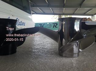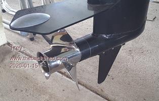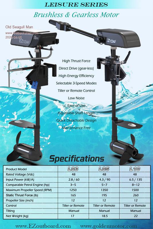 The new motors are adjustable in leg height. Absolutely a brilliant idea. They also have heat exchanger, no sea water through the motor or controller. It takes the normal car coolant for corrosion resistance, another brilliant idea. I do like the coolant pump too, much quieter than the older design. Also for corrosion resistance, it is fitted with a zinc anode. No air through the propeller centre. The old design still had an air line where a petrol exhaust would have been, which let air through the centre. This new motor stopped the water spray up the front of the leg much better than the old design. 10kg lighter than the old design, this new outboard measured to be 40kg. The motor shaft is horizontal and runs a tooth belt to the prop shaft, much quieter running, and very smooth. Well done to Golden Motor for developing a brilliant outboard.