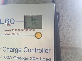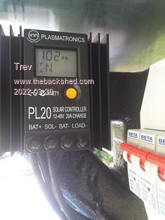 The internal clock started yesterday after noon when I connected the battery. 102Ah in over the 24 hour period. Another 6Ah in after the clock changed to the new day, to get the battery full again. The battery size is 100Ah. Still have sun available, but the shadows are getting longer.