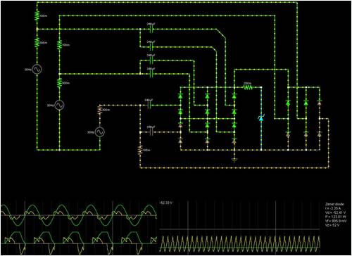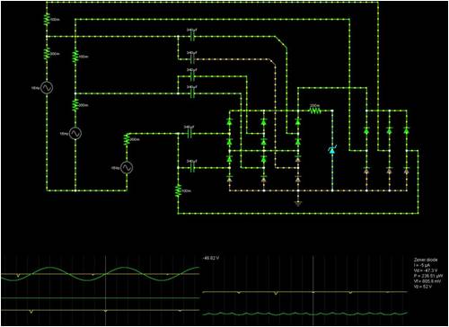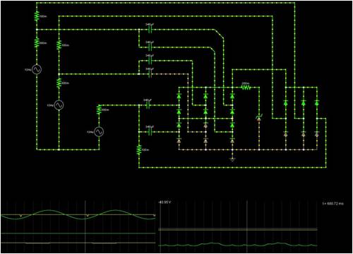 Some good news for readers. Sparweb has found a neat program simulator that can show us non engineers visually the goings on with the cap voltage multiplier. Here is a link to the program. link. Here is the code needed to be imported that shows a typical cap doubler with normal rectifiers. $ 1 5.0E-6 9.384708165144016 39 15.0 45 v 272 256 272 352 0 1 30.0 30.0 0.0 0.0 0.5 c 640 160 720 160 2 9.92E-4 -17.67901631491416 c 640 224 720 224 2 9.92E-4 -0.351918984121968 c 640 272 720 272 2 9.92E-4 0.3734551172509484 c 640 320 720 320 2 9.92E-4 39.17435240512117 w 640 272 640 320 0 w 640 160 640 224 0 w 272 256 272 160 0 w 272 160 640 160 0 d 976 592 976 528 1 0.6 d 976 480 976 432 1 0.6 d 976 432 976 368 1 0.6 d 880 592 880 528 1 0.6 d 880 480 880 432 1 0.6 d 880 432 880 368 1 0.6 d 784 592 784 528 1 0.6 d 784 480 784 432 1 0.6 d 784 432 784 368 1 0.6 w 784 592 880 592 0 w 880 592 976 592 0 w 784 368 880 368 0 w 880 368 976 368 0 w 720 320 816 320 0 w 816 320 816 528 0 w 816 528 880 528 0 w 720 272 832 272 0 w 832 272 832 432 0 w 832 432 880 432 0 w 720 224 896 224 0 w 896 224 912 240 0 w 912 240 912 528 0 w 912 528 976 528 0 w 720 160 912 160 0 w 912 160 944 192 0 w 944 192 944 432 0 w 944 432 976 432 0 g 976 592 976 624 0 r 976 368 1072 368 0 1.0 z 1072 592 1072 368 1 0.805904783 44.0 w 976 592 1072 592 0 w 272 352 272 592 0 v 352 384 352 480 0 1 30.0 30.0 0.0 2.0943951023931953 0.5 v 496 464 496 592 0 1 30.0 30.0 0.0 4.1887902047863905 0.5 w 352 480 352 592 0 w 352 384 352 320 0 w 352 320 640 320 0 w 496 592 352 592 0 w 352 592 272 592 0 d 784 528 784 480 1 0.805904783 d 880 528 880 480 1 0.805904783 d 976 528 976 480 1 0.805904783 w 976 480 880 480 0 w 880 480 784 480 0 c 720 528 640 528 2 0.0010 0.3609152093302752 w 784 528 720 528 0 c 704 432 640 432 2 0.0010 23.06587609907122 w 784 432 704 432 0 w 640 528 640 432 0 w 640 432 496 432 0 w 496 432 496 464 0 d 1168 592 1168 480 1 0.805904783 d 1168 480 1168 368 1 0.805904783 d 1232 592 1232 480 1 0.805904783 d 1232 480 1232 368 1 0.805904783 d 1280 592 1280 480 1 0.805904783 d 1280 480 1280 368 1 0.805904783 w 1280 368 1232 368 0 w 1232 368 1168 368 0 w 1168 368 1168 304 0 w 1168 304 976 304 0 w 976 304 976 368 0 w 1280 592 1232 592 0 w 1232 592 1168 592 0 w 1168 592 1072 592 0 w 640 528 640 656 0 w 640 656 1312 656 0 w 1312 656 1312 480 0 w 1312 480 1280 480 0 w 352 320 352 112 0 w 352 112 1120 112 0 w 1120 112 1120 480 0 w 1120 480 1168 480 0 w 272 160 272 64 0 w 272 64 1200 64 0 w 1200 64 1200 480 0 w 1200 480 1232 480 0 o 0 64 0 35 40.0 102.4 0 -1 o 38 64 0 35 80.0 51.2 1 -1 This App is an interactive unit, and frequency and voltages and capacitor sizing can be altered, etc. Multiple components can be graphed to show related interactions. Well done Stephen, finding this. I think we are free to download and use it. Here is a pic of typical display. App is good on a large, high res monitor.