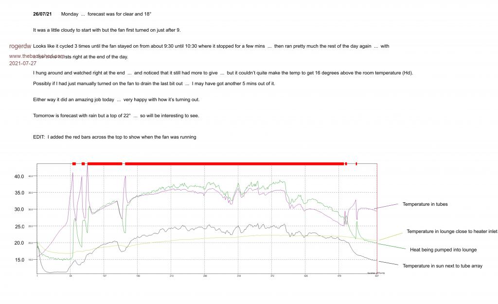 Quote  I think if Roger can pump good heat into his house though the day and regularly, it will work well for him too. If he can get the place to say 25 During the day and let it drop at night, the heat will be radiating not the cold.
