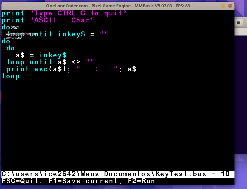 OK, this might help: If you can copy that code into a text file and save it as "KeyTest.bas" and drag it into MMB4W it will wait for you to hit a key then print the ascii code (decimal) and the printable character. Bill Keep safe. Live long and prosper. |