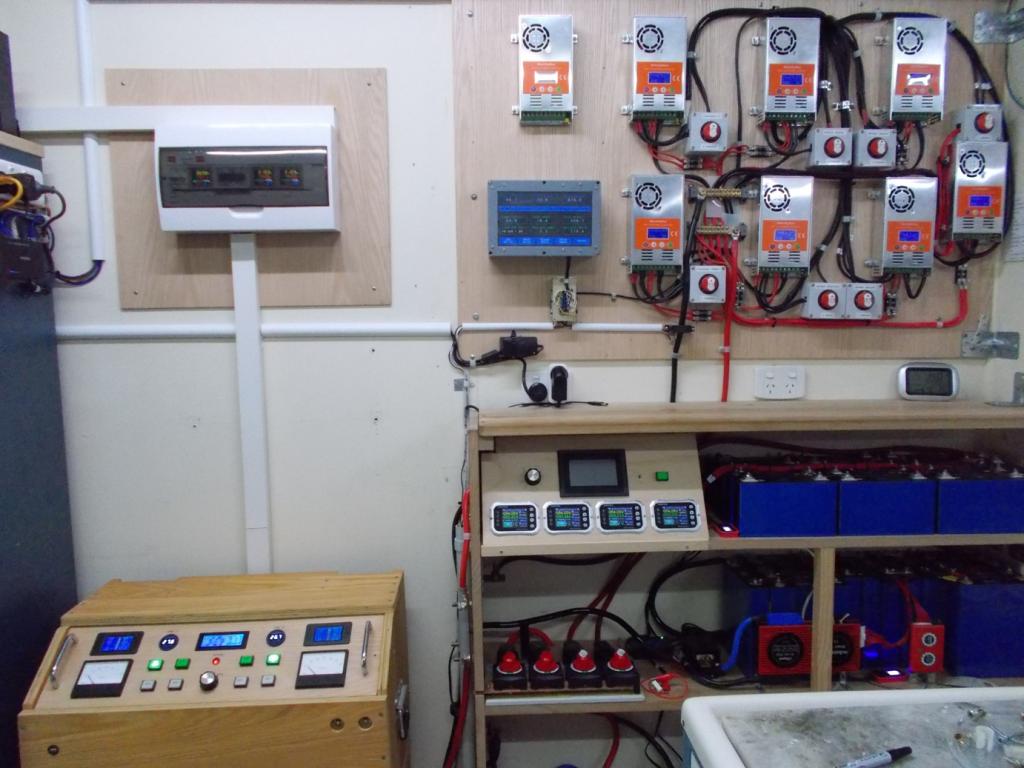 Finally finished getting a new 10mm2 Power cable run from the Main Fuse box to the Shed, and the power box upgraded with new RCBO switches and the Generator input change over ATS switch installed. The 10mm2 was for the Generator input from the Dual Inverter located in the Shed. Since we have been running the bigger 3.6kw 280ltr Hot water system on the Inverter, combined with cold winter mornings requiring the Reverse cycle Aircon running for about 30 minutes before getting out of bed, and an hour after that, a ceramic heater in the bathroom combined with the Washing machine on a hot cycle (2.6kW) and boiling the Jug, with other household loads I have seen over 9kW on the Inverter in the mornings, usually the morning battery level is around 64% before the sun rises, it's impossible to tell we're running off grid, and Inverter running cold BTW. When I started the journey a few years ago, I never thought it possible to build a DIY Inverter good enough to power everything without caring about how many lights are left on, or how many times you boil the jug or how many late night movies you watch, or run the Aircon all night or use Hot water like we are on Mains AC, and more importantly (impressively), not worrying about how much power we are actually drawing from the Inverter at any given time, knowing that it can handle everything I can throw at it with ease, providing the batteries can keep up with it at night Below: The pix has optical distortion and is a bit blurred, sigh, but this shows the Solar wall with the eighth 60A Solar regulator waiting for the last solar panel array, which is sometime down the track as the Solar in-feed tariff from the old 2010 system runs out in two years, at which time we get charged to in-feed, so the old system will be junked, if it lasts that long, and a set of new panels will be installed to also feed the low voltage solar wall. We will likely have no trouble running totally off grid in Winter under bad Solar conditions, we can do that now with the occasional day or two of really bad weather. A small wall mounted power cabinet above the Inverter has two AC displays to monitor power from the Dual Toroid outputs, a display for combined 240vAC output and a separate higher quality kWh meter to verify and accurately log total kWh. There are two output cables exiting the top of the Power case, one is a switched Inverter 240vac output (Generator) via a 10mm2 cable running to the main fuse box for powering the entire property. A separate switched output allows powering just the Emergency circuits and Shed (workshop) in the case of an extended Mains power outage under prolonged bad Solar Weather conditions. Everything is automatic via an ATS unit in the House Fuse Box and another ATS in the Shed Fuse Box, each controlled by two 45A Circuit breakers (switches) in the Inverter wall Power case. The only things to complete the system now are four heavy duty metal Battery Boxes on castors, should only take an hour or two to transfer all the cells, BMS's etc across. _ Edited 2025-08-28 08:56 by KeepIS NANO:Inverter V 8.2ks - Linux AvrDude GUI script V4.1 |