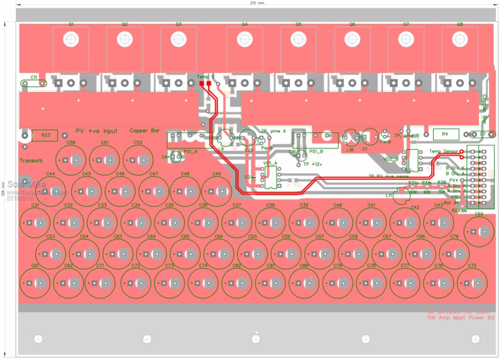 Right cracking on, completed prototype pcb for the above power module, only minor changes to the schematic, for heat sinking have decided to use alloy 30mm x 30mm x 6mm thick right angle for mounting the mosfets, it goes between the mosfets and the top pcb layer and acts as the common conductor for their drains, no insulators. The right angle bolts to the main case housing using nylon screws and a thin silpad insulator strip; at full power 8Kw output approx 60 watts of heat will be generated, so not much heat to get rid of. 45mm^2 copper bars bolt to the top copper areas for joining the mosfet source connections via a 4mm bolt and copper washer, mosfet pcb footprint pads not used except for the gate; bottom of pcb has a similar bar on underside as battery 0 volts common, 50 caps shown each with ceramic bypass (only used when mppt module connected, otherwise most are left out.) Bottom layout shows how the individual mosfet driver chips are connected, they require the large pad areas on the legs for heat sinking, should anyone want to use them in their own designs. I think the mppt module will have a similar construction theme, haven't looked at it yet. Cheers Mike |