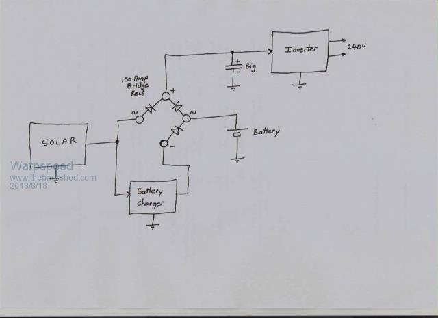Just realised the Allegro type of sensors are what you are using anyway, DUH ! Always possible to solder lugs onto the sensor, and then bolt the whole thing in position with a three pin socket and cable for the thinner legs. The whole problem of a very high power solar controller are vexatious. I get around this myself, by running my inverter directly from the solar panel voltage, this provides a much higher power efficiency and there is much less to go wrong. All that is then required is a smart solar controller of much lower power capability to charge the battery. Its all built around a suitably large bridge rectifier plus heat sink. The fourth diode is obviously still there, but does nothing. Its drawn the way it is to make the whole thing more easily understood. You may need to think about this for a while. It totally changes how the the whole system and each part of it works day/night, and what each part of the system needs to do. This would be more appropriate if anyone is planning a higher dc voltage system. ![]() Cheers, Tony. |
