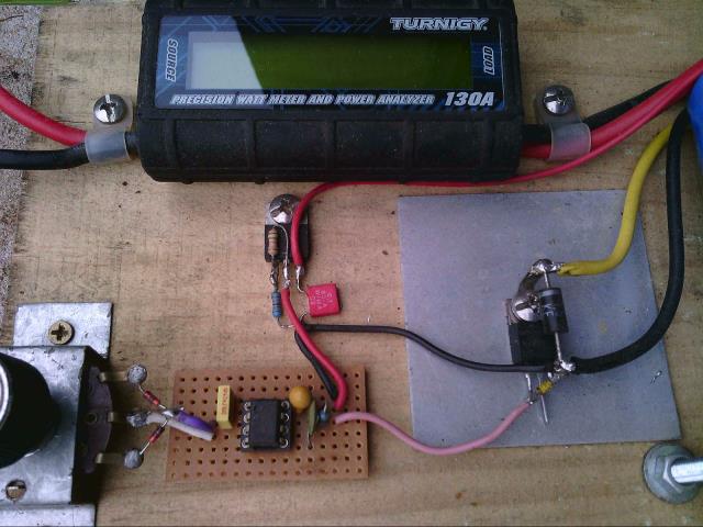 Run the 555 at much higher frequency, say 20 Khz or higher. That should really shrink down the ripple amplitude. Also, two large capacitors with a choke in between, would be beneficial, but probably not necessary. Try it and see. The problem with the Turnigy is that its so good ! It has four digit resolution, and so if what is being measured is noisy, the lowest digits are going to be just chaos and unreadable. The other thing is the very wide load adjustment range possible. A ten turn potentiometer and/or a much larger knob would definitely help if you are trying to set the loading to a specific voltage, current, or power. This schematic was stolen from the internet, but is how I did the duty cycle adjustment: ![]() Its pretty rough and ready, but here is a closeup. ![]() Cheers, Tony. |